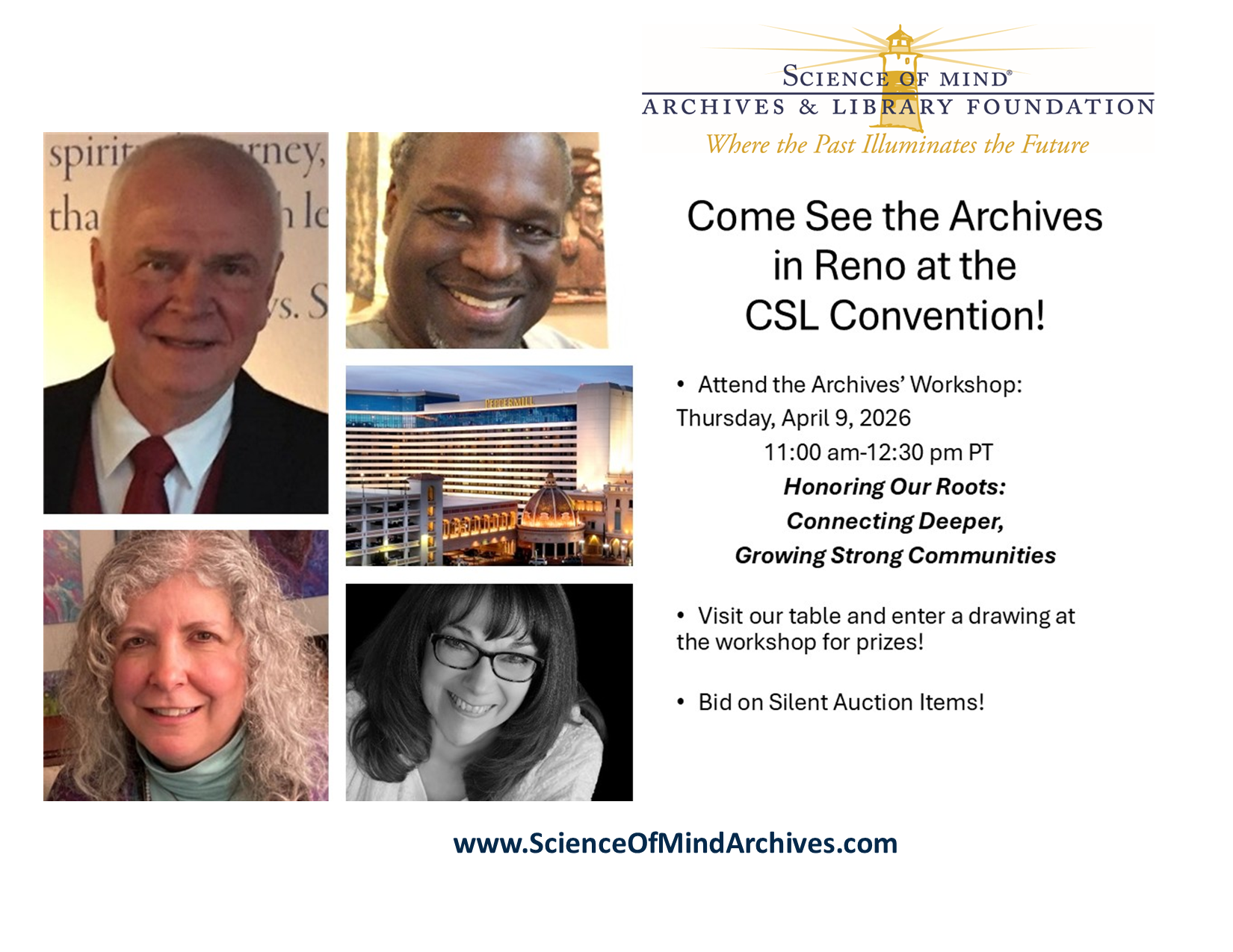 The Science of Mind Archives is EXCITED to be joining all of our Centers for Spiritual Living and New Thought friends in Reno, Nevada for the 2026 Spiritual Living Convention! If you are coming, please come visit us at our table and be sure to attend our Workshop on Thursday, April 9, 2026 from 11 am to 12:30 pm: Honoring Our Roots: Connecting Deeper, Growing Strong Communities with Rev. Kathy Mastroianni, Dr. James Van Cleave, Dr. Kristina Collins and Rev. Rodney Gittens! Looking forward to seeing everyone there.